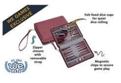 One of our most popular sets! This handsome 9 inch burgundy backgammon set is adored for its compact size carrying strap and zipper closure. It is also magnetic for easy play. Makes a wonderful travel companion! Dimensions: Attache Open: 9″ L x 14″ W x 1″ H Attache Closed: 9″ L x 7″ W x 2″ H. Ages 8