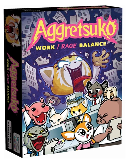 Aggretsuko is a fast-playing card game for 3-6 players, where each player takes the role of a mild-mannered office worker trying to get through their work each day. If a worker becomes frustrated, they can RAGE to let out their inner heavy-metal rock star. RAGING will provide some much-needed relief from the daily grind, but it may have consequences later on.