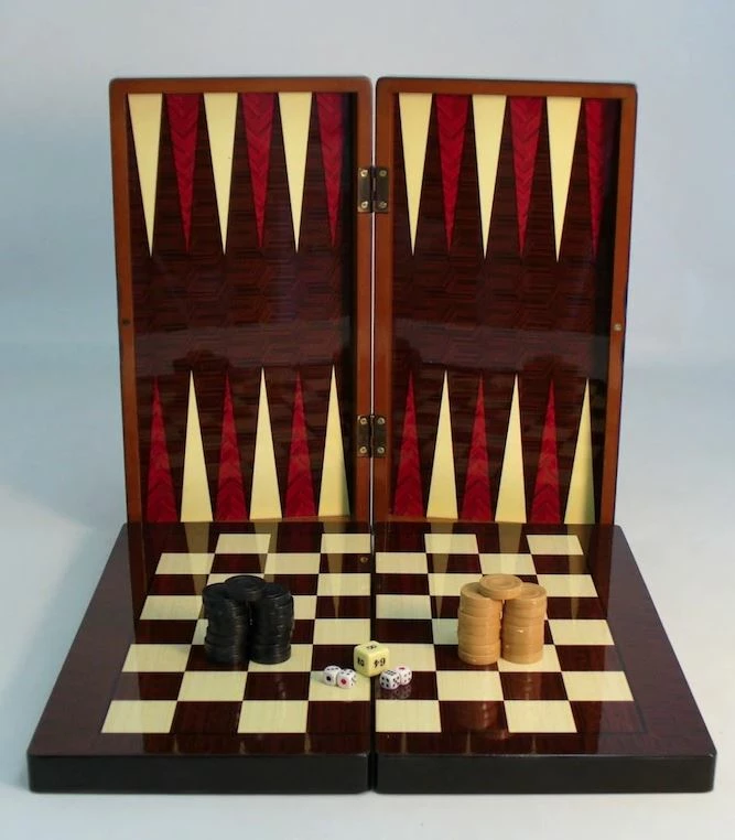 BACKGAMMON: 15″ WOODGRAIN DECOUPAGE WITH CHESS BACK