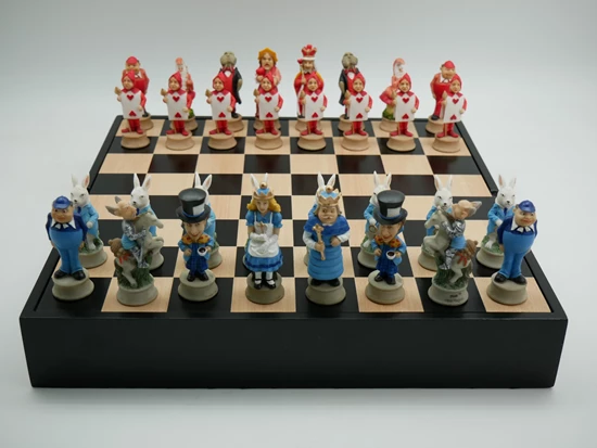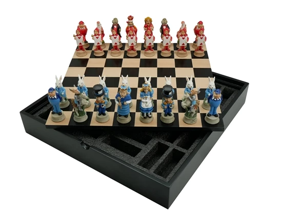 Alice in Wonderland Hand painted Resin Chessmen, 3.25″ King height with 1.5″ base and felted bottoms. Chessmen are on 13.5″ Black and Maple Chest. The storage for the chess pieces is conveniently under the board.