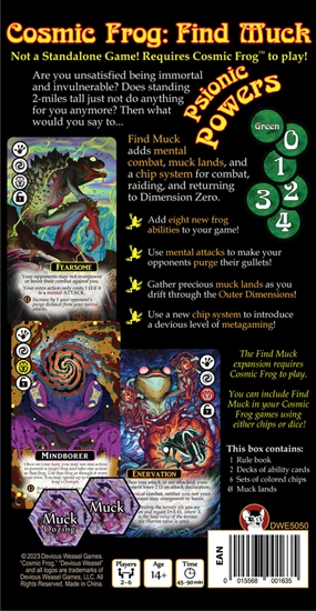 The Cosmic Frog: Find Muck expansion adds mental powers to the game so that your frog is no longer merely immortal and invulnerable, but psionic as well! Mental powers open the way for mental combat and gullet purging.