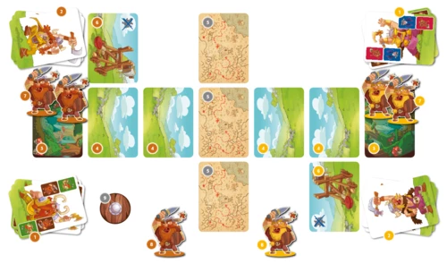 To give an order, the King chooses a card and flips it onto the table to reveal two orders on its back, with no clue as to which is the right one. The Warchief checks the battlefield, then tries to choose the right order with a card in hand. When both clans have chosen their cards, all of them are revealed, and if both cards match on a clan, then the order is carried out. Some examples of orders: loading the catapult, firing with the catapult, progressing toward the Queen, looking at hidden cards in the middle to find the Queen, and avoiding traps…