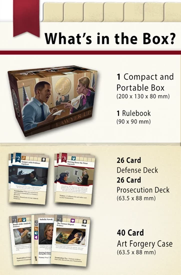 Lawyer Up is an asymmetrical two-player courtroom drama card game where one player is the noble prosecution and the other the steadfast defense. Each game begins with Discovery, where players draft vital evidence to support their case and bury evidence that might help their opponent. Next comes the Trial, where players call witnesses and play powerful arguments along with the evidence they drafted into their examinations. To form a coherent line of questioning, players will need to chain together their cards by matching bias symbols. The player who can best examine the Witness will spend Influence to sway the Jury to their side. Every game is different, but the lawyer with the best case and most convincing arguments will be sure to get the verdict they are after!