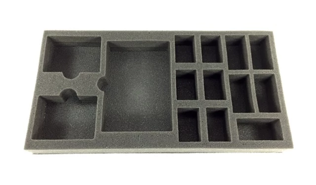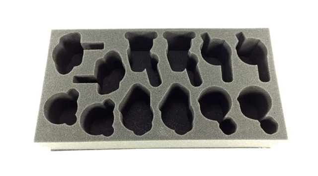 - 1x 1.5 inch (38 mm) thick tray with 5 x 1 1/4 x 2 1/2 (31 x 63 mm) cut outs, 6x 1 1/4 x 2 inch (31 x 50 mm) cut outs, 1x 4 1/4 x 6 (108 x 152 mm) cut out, and 2x 3 1/2 x 2 3/4 inch (89 x 70 mm) cut outs.
