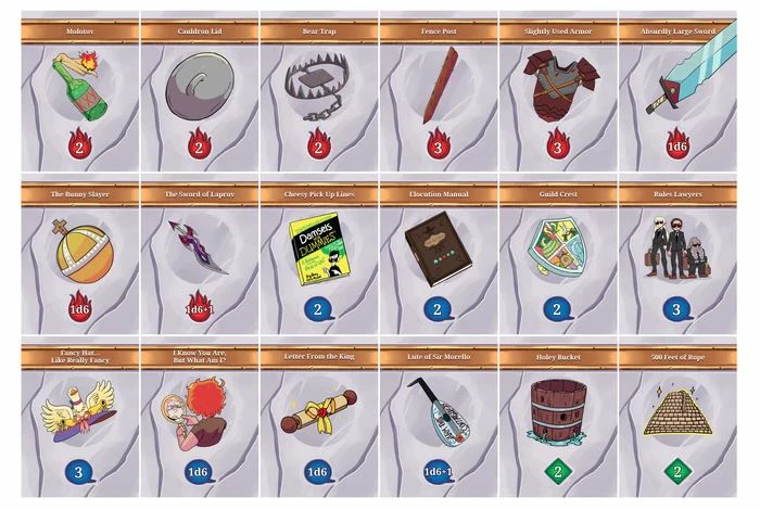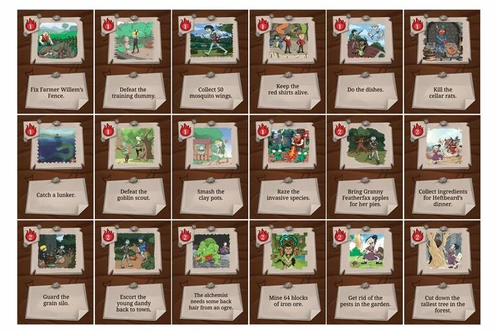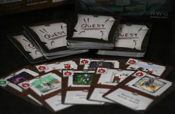 Each player is represented by a character, which have unique stats and special abilities. Players take turns adding quest cards (with difficulty values that correspond to player stats) to the notice board until a player is challenged. When a player is challenged, they see if their stats (and loot, if needed) can overcome the challenges of the quests.