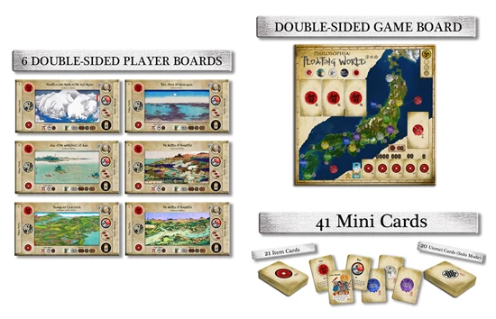 Philosophia: Floating World fuses innovative game mechanics closely to its theme to create a satisfying and streamlined experience. Using a unique fusion of deckbuilding, ‘I cut you choose’ and simultaneous play, it is designed to be endlessly replayable. With 7 different game endings, 36 unique character abilities, asymmetric play and an adjustable level of difficulty in solo mode, this game has zero downtime, zero upkeep and deep player interactions, there really is something for everyone!