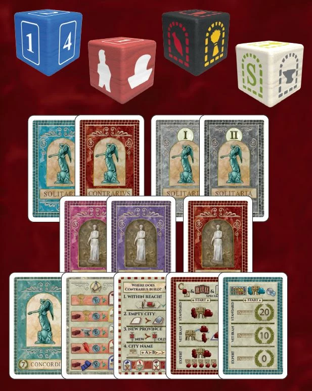 The Concordia Solitaria expansion allows Concordia to be played solo against the adversary, Contrarius. This expansion plays the same as in the base game, but it is played with special cards and dice.