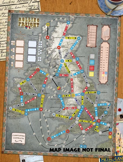 Rolling Freight: Great Britain and India, an expansion for Rolling Freight, includes a double-sided game board that features maps of Great Britain and India and new rules for canals, ferries and caravans. Canals are links that exist at the start of the game, but which become owned by individual players when rail is built over them. Cargo can also be moved using ferries and caravans, which are permanent map placements that cost one dice to cross. These new maps also include rules for improvements that decrease in cost as the phases advance.