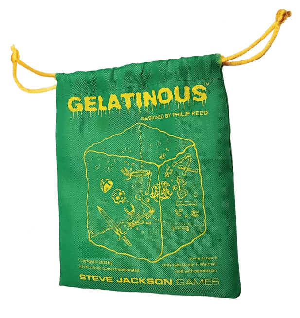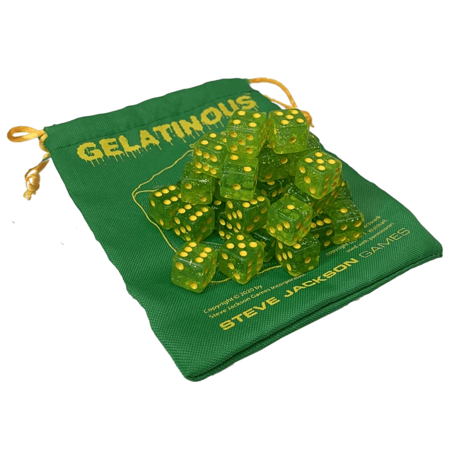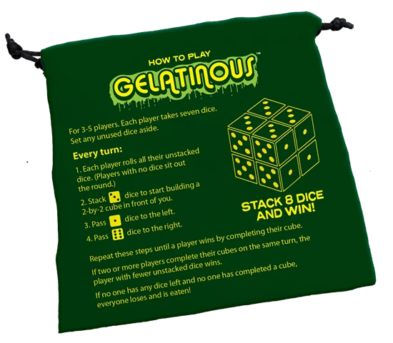 In Gelatinous, players start out as a wandering slime, using sparkling green dice to grow into a cube. But watch out, the other slimes are growing too! The first to grow into a cube wins – and the rest are lunch.