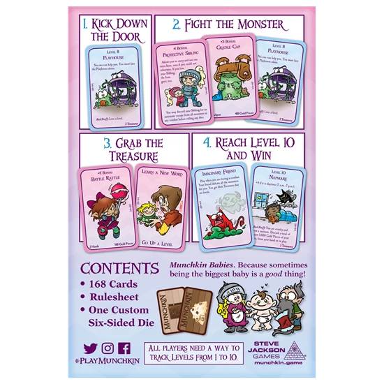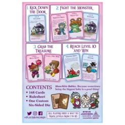 Munchkin Babies delivers 168 cards of sweet, adorable baby adventurers…who are just as good at backstabbing and loot-grabbing as their elders from Munchkin. You’ll play a a cute Orcling, Dwarfling, Elfling or Quarterling (half a Halfling), armed with the scariest items from the toy box: the Kazoo of Constant Whining, Kid-Safe Stabbinator, Blame-Resistant Pajamas, and of course, the Extremely Pokey Spoon. You must fight fearsome monsters such as the Jealous Kitty, the Hootin’ Nanny, the Napmare, and worst of all, the Pediatrician! Grab their treasure and crawl your way to Level 10!