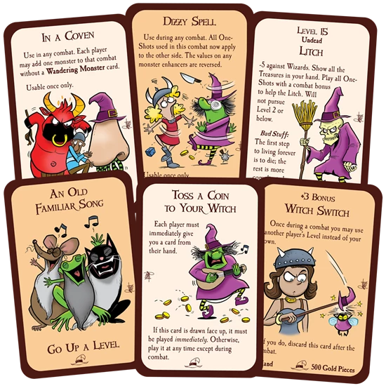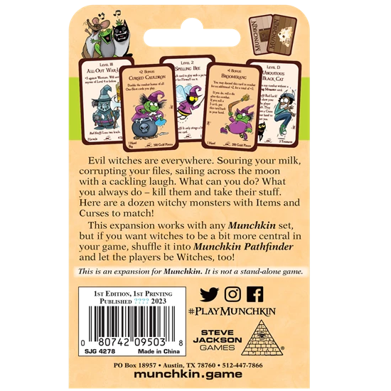 - Works with any Munchkin set, but shuffle it with Munchkin Pathfinder and the players can be Witches, too!