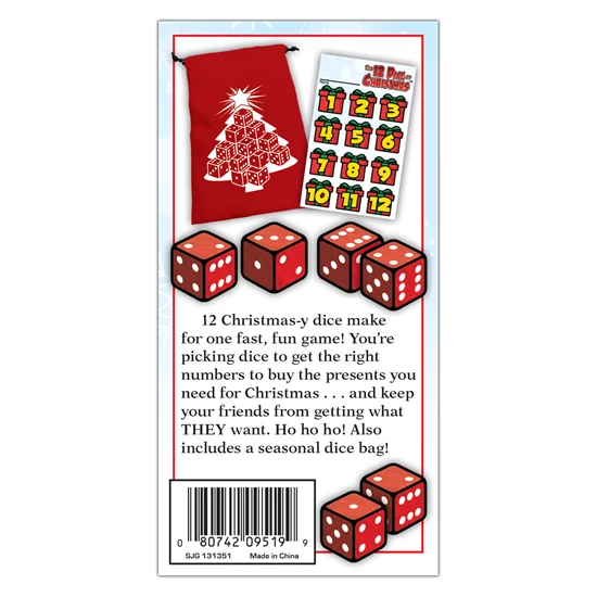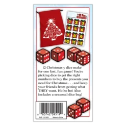 The perfect stocking stuffer! 12 Christmas-y dice make for one fast, fun game! Youβre picking dice to get the right numbers to buy the presents you need for Christmas . . . and keep your friends from getting what THEY want. Easy to learn and quick to play, this will be a holiday favorite for everyone! Ho ho ho!