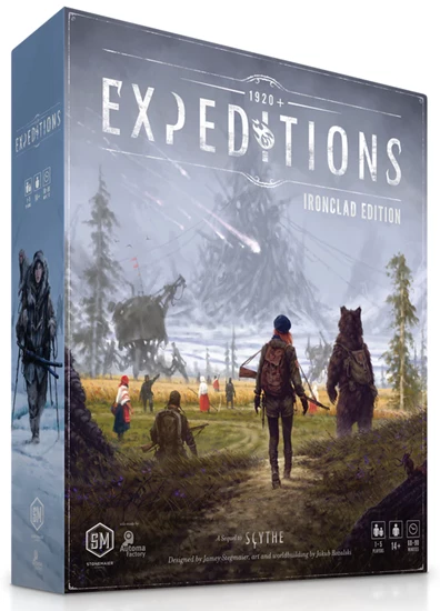 Expeditions is a competitive, card-driven, engine-building game of exploration. It is designed to evoke similar feelings to Scythe even though the mechanisms are different: Play cards to gain power, guile, and unique worker abilities; move your mech to mysterious locations and gain cards found among the tiles; use workers, items, meteorites, and quests to enhance your mech; and use power and guile to vanquish corruption.