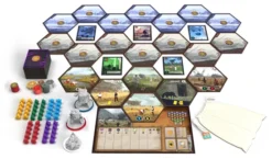 Expeditions includes 5 massive mech miniatures and mech mats, 20 location tiles, over 100 uniquely illustrated cards, 50 worker meeples, a bag filled with 36 silkscreen printed corruption tiles, a robust Automa solo mode, and much more.