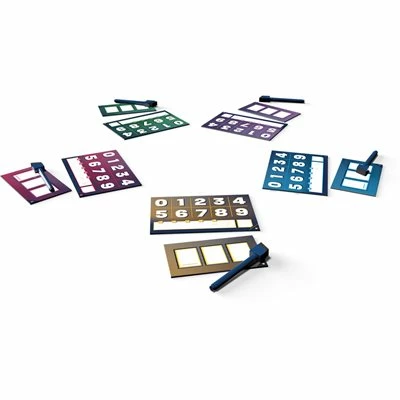 Each round, all players secretly write a number from 000 to 999 on their tablet, using the digits from 0 to 9, and then they are all revealed at the same time. Writing a large number earns more points, but it’s also a risky gamble… because if you have a number in common with one of the smaller numbers revealed by one of your classmates, you don’t score any points! As the round progresses, you can no longer use the numbers you have used before, so the possibilities gradually narrow. It’s up to you to make the right choices, to bet high or to make yourself very small to keep your chances on the last rounds. After 2 rounds, get the highest score to win the game.