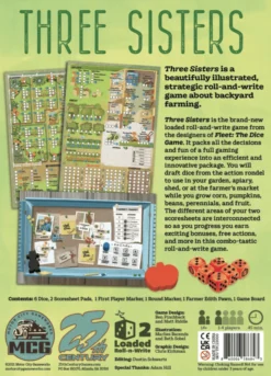 Three Sisters is a strategic roll-and-write game about backyard farming. Three Sisters is named after an indigenous agricultural technique still widely used today in which three different crops — in this case, pumpkins, corn, and beans — are planted close together. Corn provides a lattice for beans to climb, the beans bring nitrogen from the air into the soil, and the squash provides a natural mulch ground cover to reduce weeds and keep pests away.