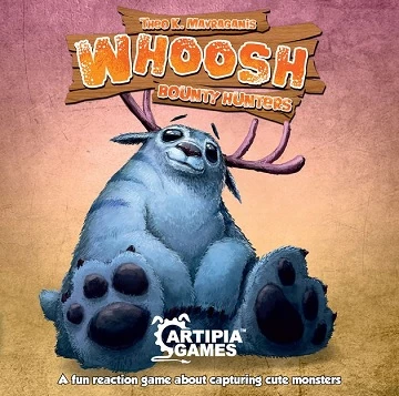Whoosh: Bounty Hunters is a fun, fast-paced reaction game in which players try to capture monsters and collect bounty. Each player has a face-down pile of cards in front of them with weapons and spells. Three monster card piles are at the center of the table, each with a revealed card in front of it. Each monster requires a different combination of weapons or spells or both to be captured. The players, one by one, reveal cards from their piles. As soon as the cards revealed by all the players meet the requirements of one of the monsters, they must quickly place their hand on it. The first player to do so captures it and gets to score its points. If a player tries to capture a monster without all the requirements met, they get a negative point instead.
